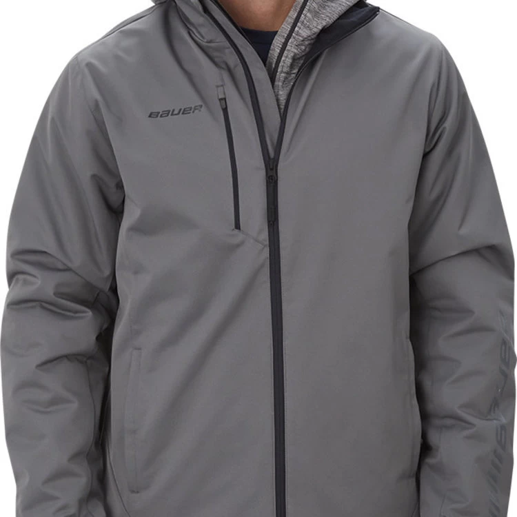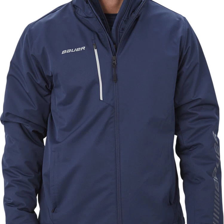 - Bauer screen-printed logo on left sleeve, right chest, and back neck.