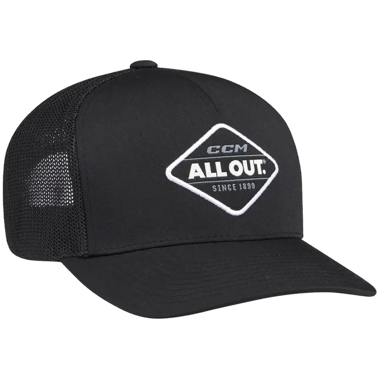 Represent the ALL OUT philosophy with the CCM ALL Outside meshback trucker cap. A structured mid crown trucker cap displaying the inspiring ALL OUT logo is an expression for the love of the game, and the all out, all the time, on or off the ice attitude.