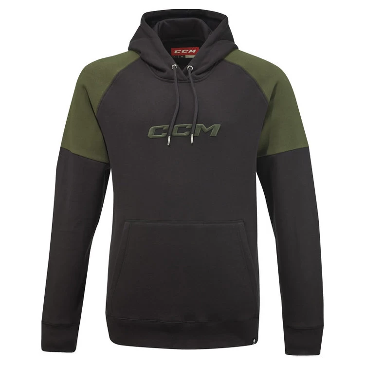 The CCM camo pullover hoodie is everything you want and need in a hoodie. Featuring a crossover hood with drawcord, a kangaroo-style pocket, and an edgy camo pattern on the shoulders, this sweatshirt is the perfect blend of comfort and trendy style.