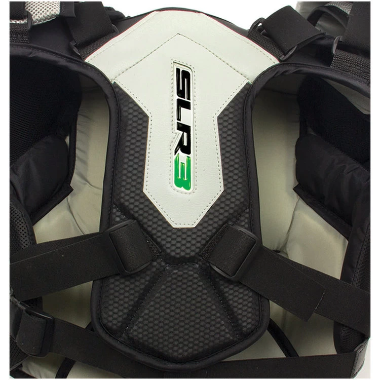 Vaughn’s SLR3 Goalie Arm and Chest Protector for the Junior Player has an increased shoulder floater area and thickness in the bicep and forearm padding. The SLR3 adds a Velcro adjustable back spine padding with HD protection and an extra large belly flap to help protect from the puck.