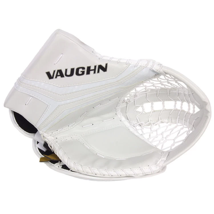 Vaughn’s Velocity V10 Pro Goalie Catch Glove is an all new design and shape to maximize net coverage. The Velocity V10 Pro has a new wide span and deep T-web design along with a one-piece cuff and thumb. With an easy close design with deep pocket area, molded palm and front thumb insert along with defined break points for easy closing the Velocity V10 Pro will help you make the big save.